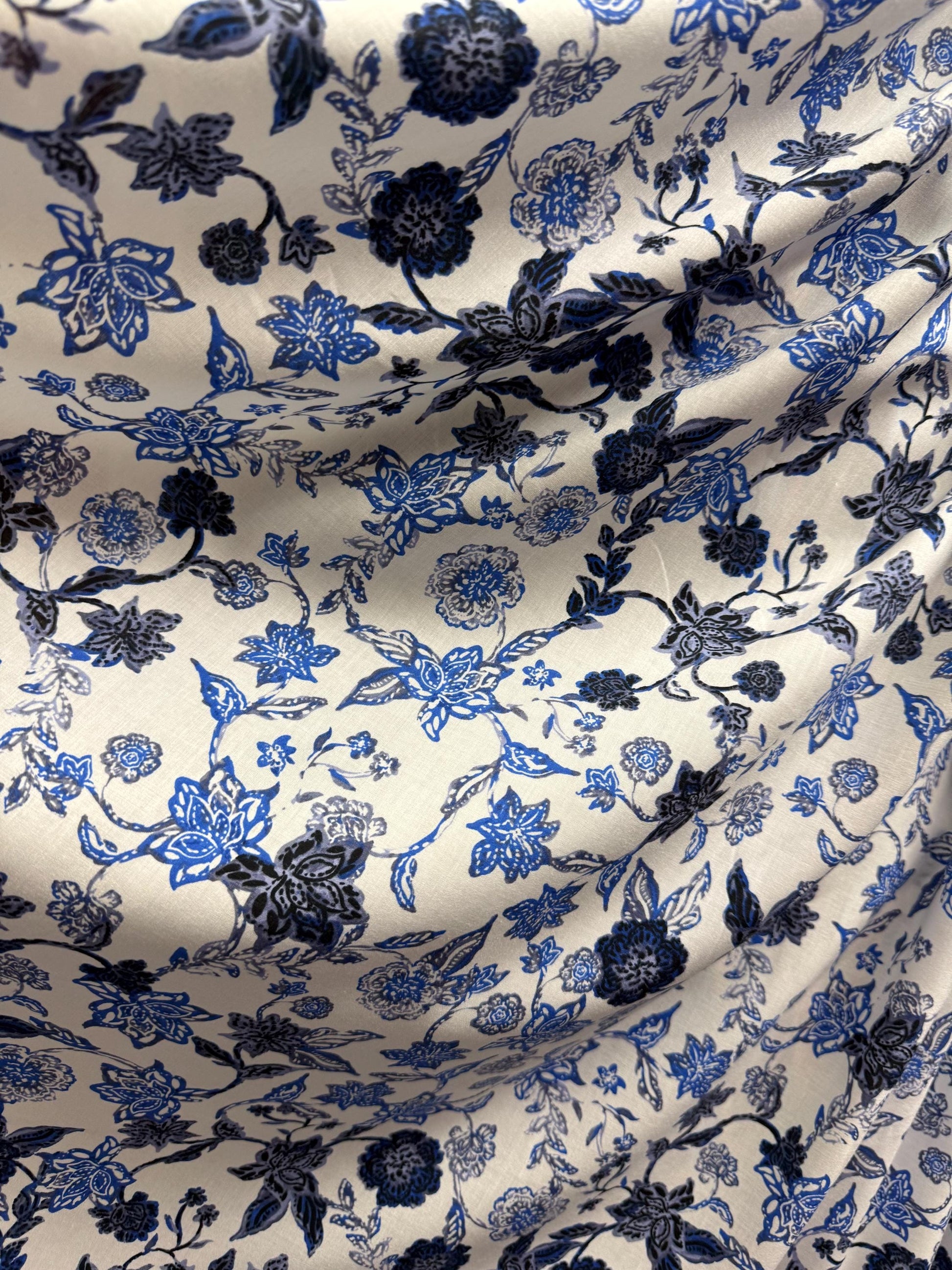 This gorgeous rayon challis fabric features a delicate blue and black floral print on a soft off-white background. Lightweight with a fluid drape, this fabric is perfect for airy, comfortable garments that move beautifully. Its breathable nature makes it an excellent choice for year-round apparel projects.